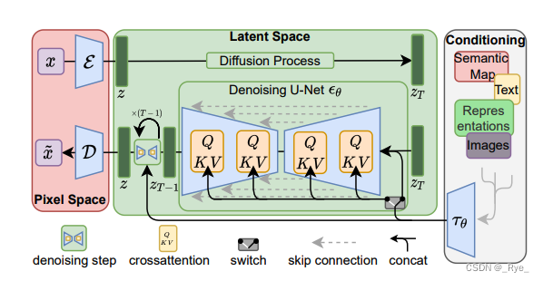 这个过程,可以结合 Stable Diffusion 相关论文里的一张模型架构图来看。