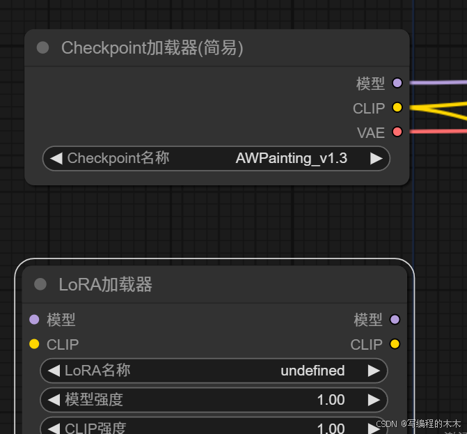 然后通过串联的形式,将Checkpoint模型和Lora模型的模型接口对应链接上,将CLIP接口链接上,最后CLIP对应链接到文本编码器(正负提示词节点)即可。对应Lora选择相应模型即可。