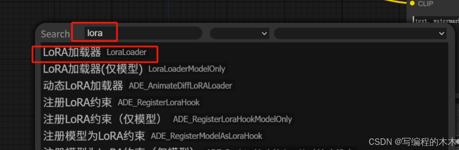 在Webui中我们知道,lora是加在正向文本里的,但是在Comfyui,lora有单独的节点,我们双击画布空白处,搜索Lora,就可以找到Lora节点并点击就可以添加到画布。