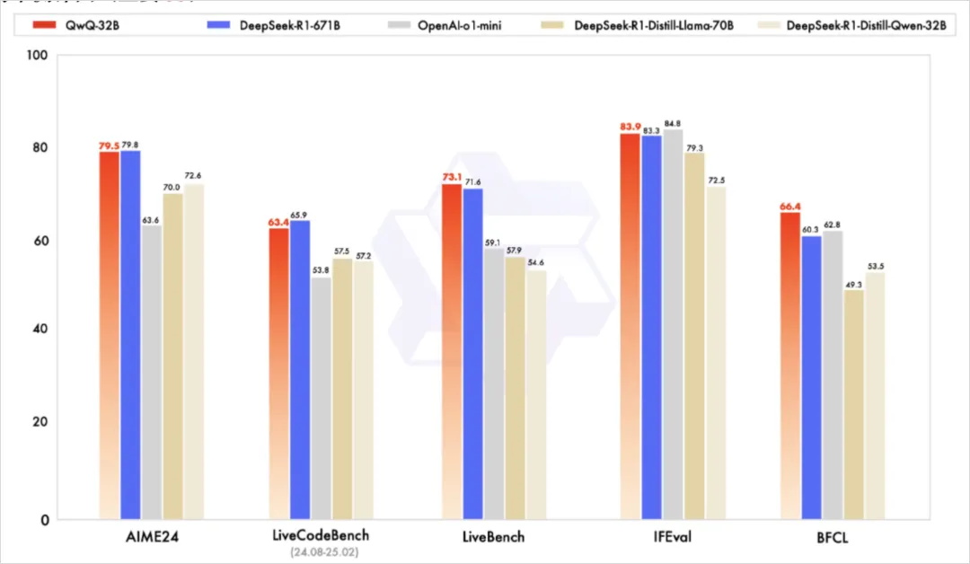 而且,QwQ-32B 在基准测试上的性能跑分,几乎拉开 o1-mini 一个身位。