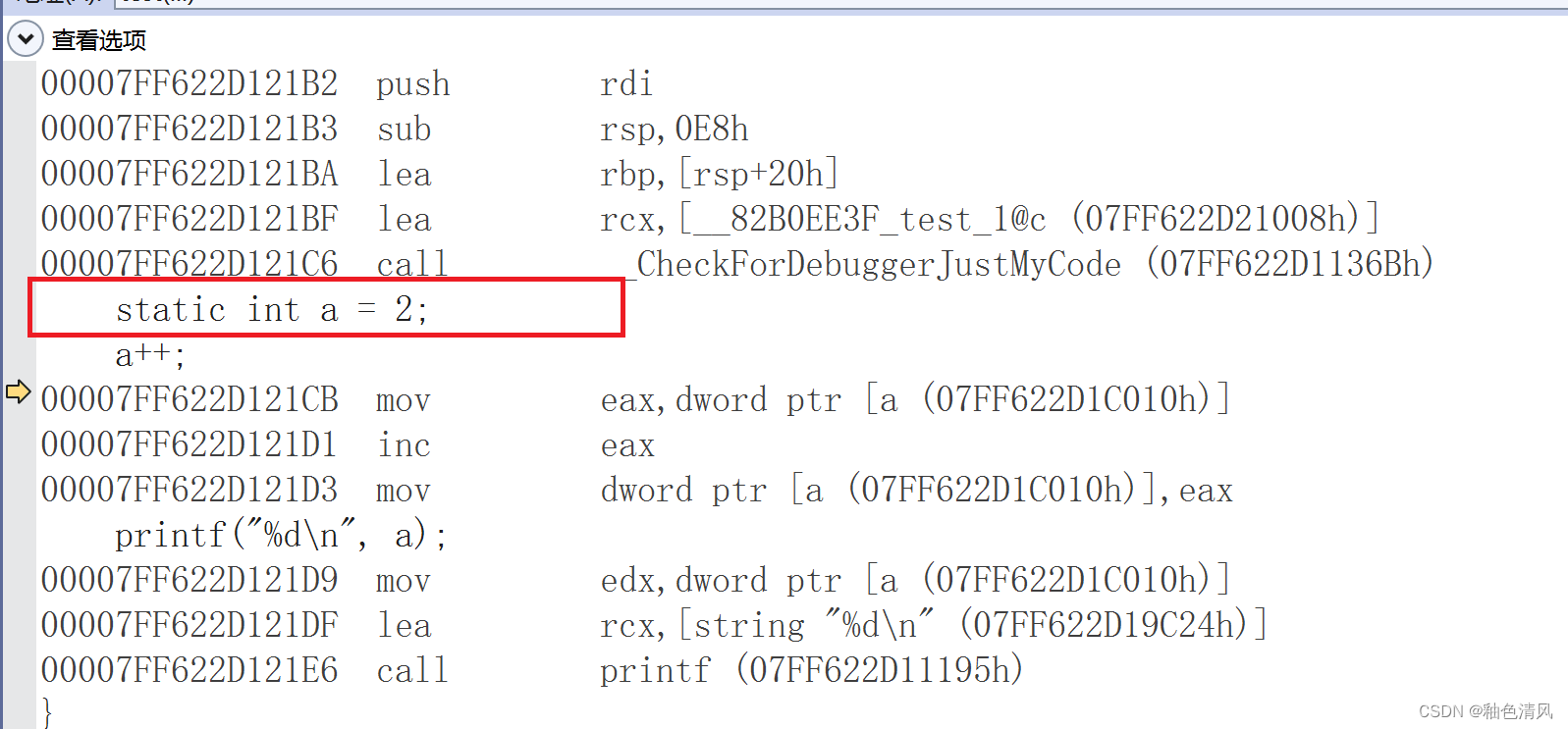 static修饰局部变量使得变量的存储位置发生了变化,本来局部变量是放在栈区的,被static修饰后,放在内存的静态区,生命周期变得更长了,但是作用域没有发生变化。