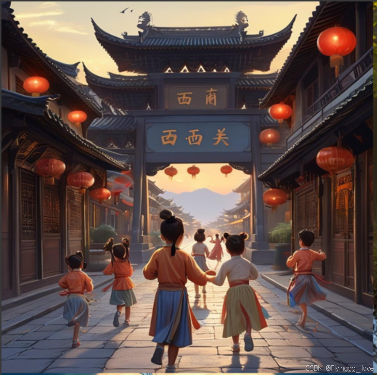 prompt="古风,古镇黄昏时分,炊烟袅袅升起,一群身穿古装的孩童在街道上追逐嬉戏,远处可见一座宏伟的城门,城门上写着“西门关”三个字",