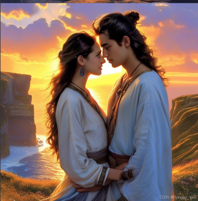 prompt="中国风,英俊的青年与女人站在悬崖边,背后是夕阳西下的壮丽景色,二人紧紧相拥,誓言永远不分离",