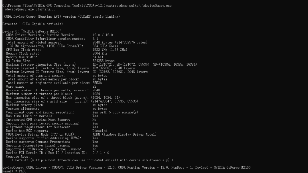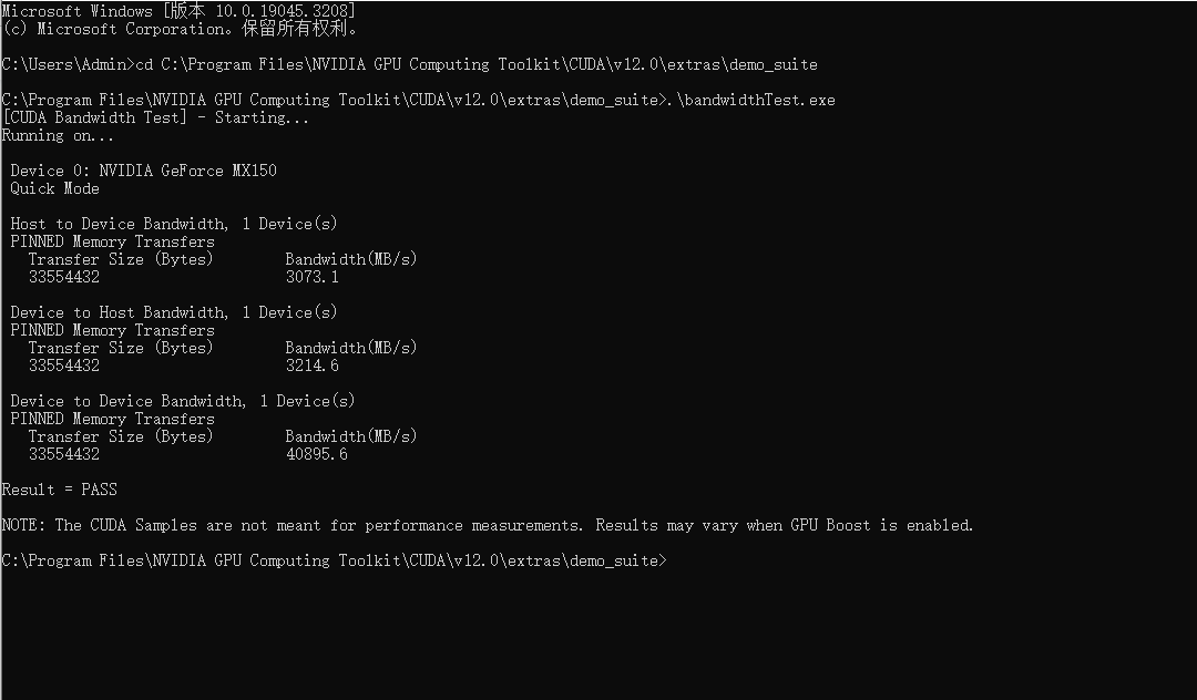 验证配置是否成功配置完成后,我们可以验证是否配置成功,主要使用CUDA内置的deviceQuery.exe 和 bandwidthTest.exe: