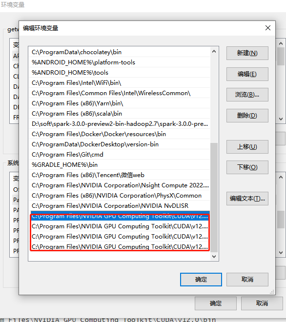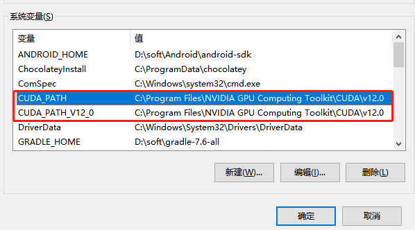 CUDA 的安装路径在前面截图中有,或者打开电脑的环境变量查看,我的安装路径如下: