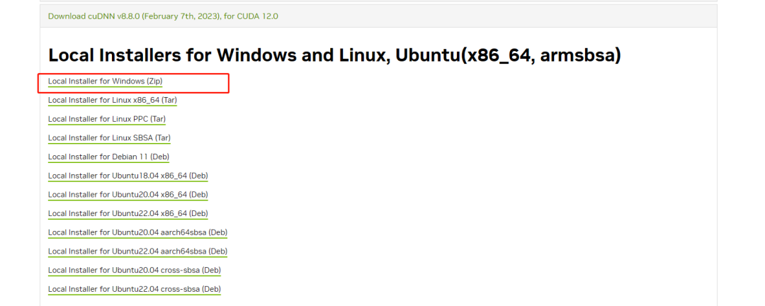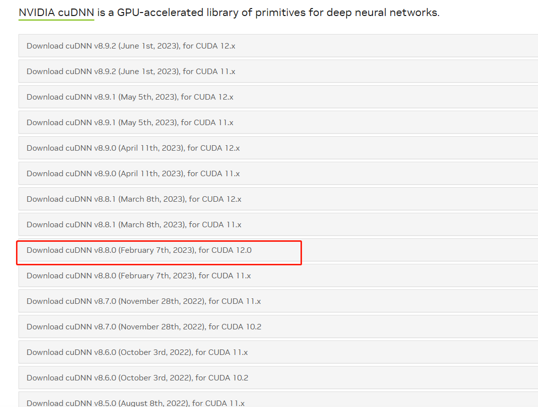 选择跟自己的cuda版本适配的cudnn版本,此处我安装的是CUDA12.0,因此我选取下面的版本: