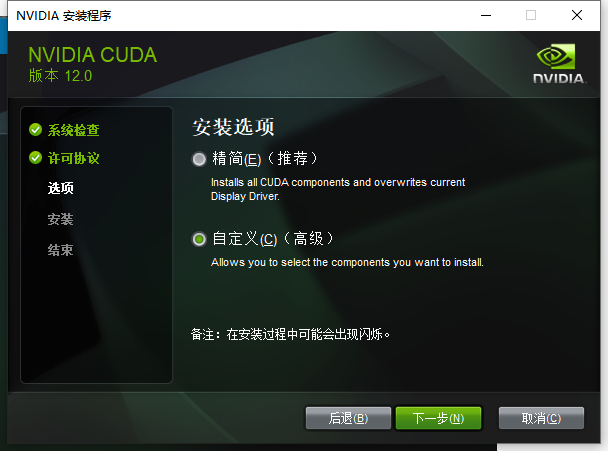 选择自定义安装,精简版本是下载好所有组件,并且会覆盖原有驱动,所以在这里推荐自定义下载。