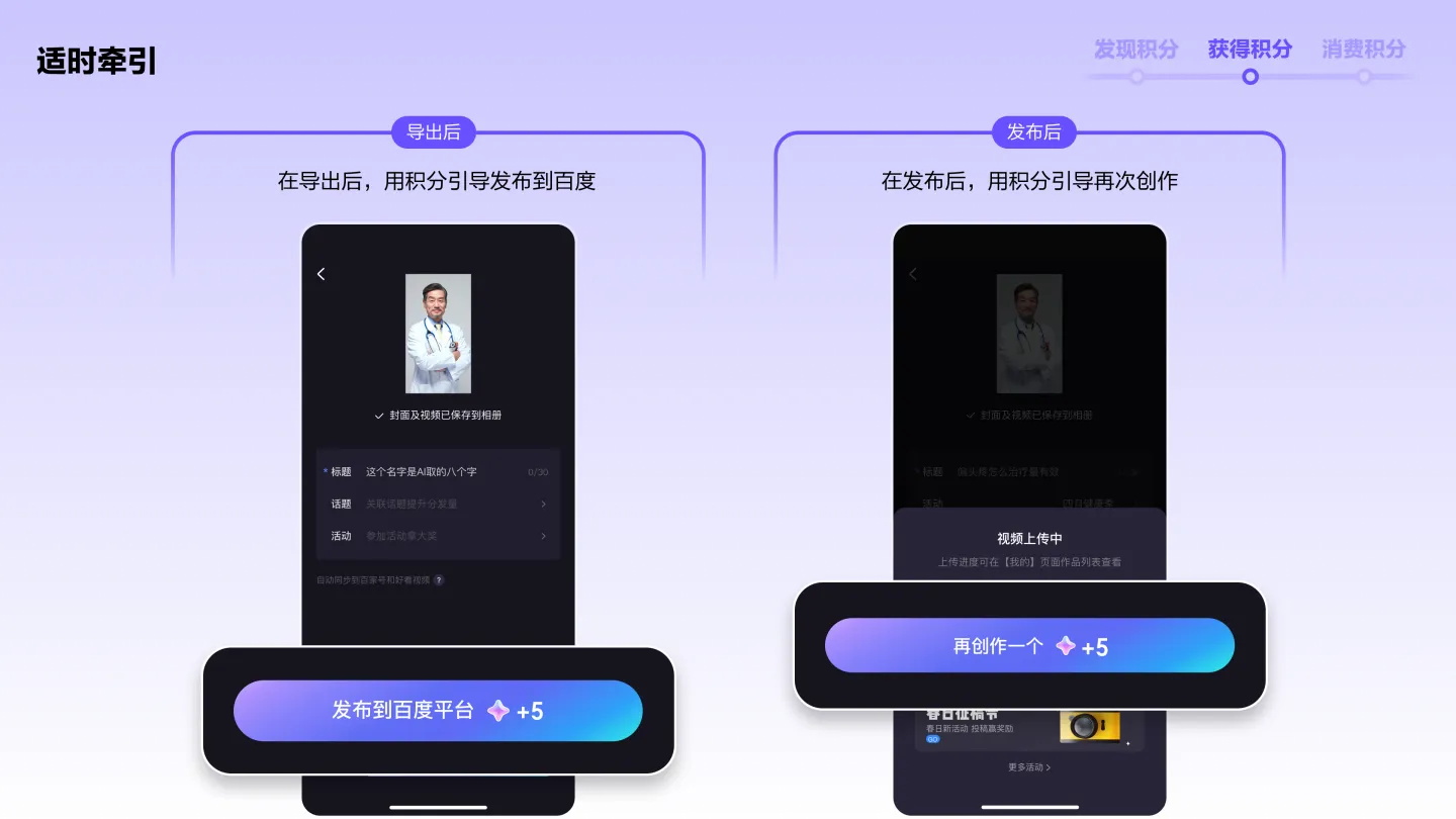任务完成过程中增加适时引导,刺激用户完成更多任务,如导出作品后用积分引导发布到百度,同时提醒用户再次创作获得积分,形成多创作多积分的用户心智。