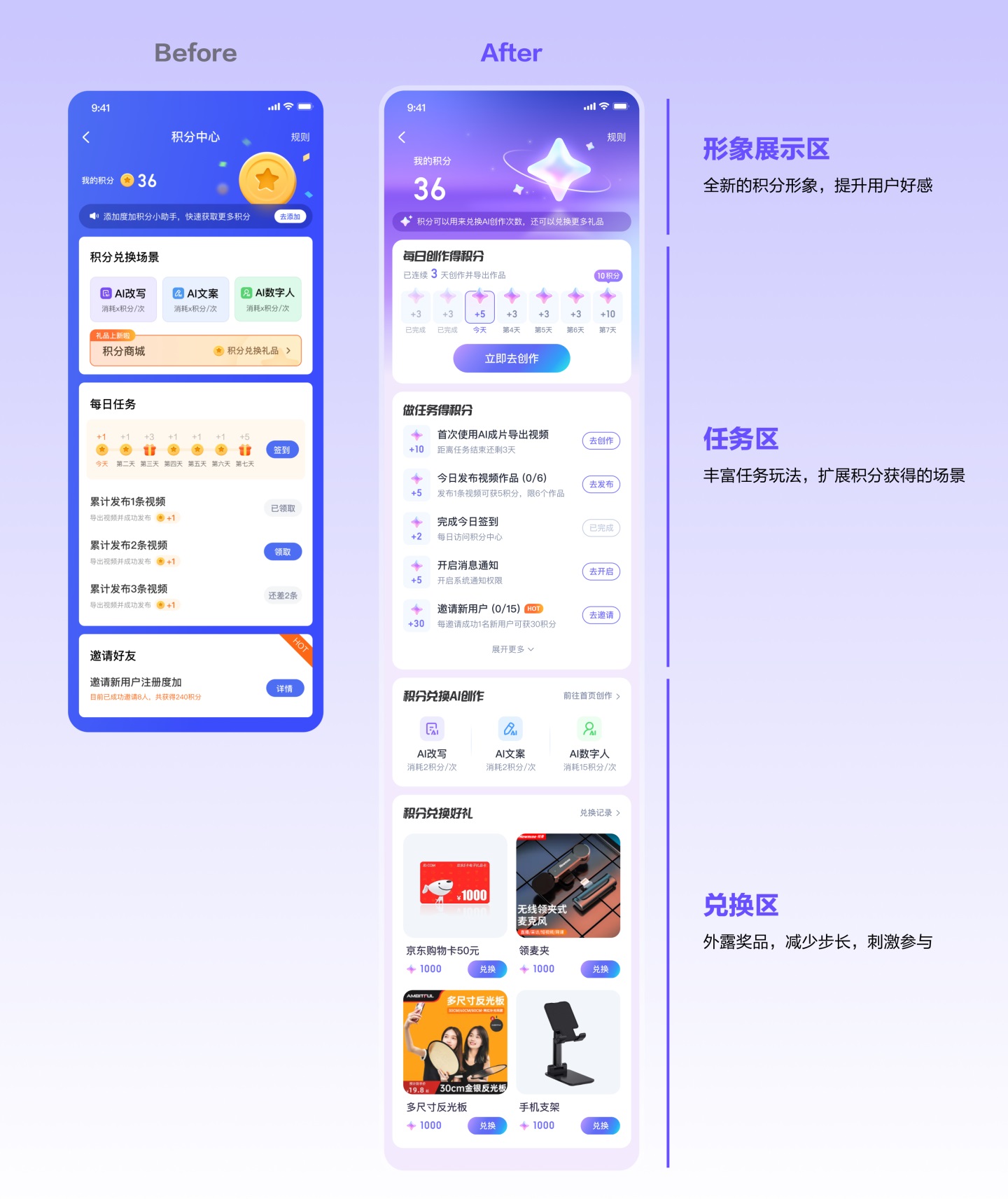 积分系统的全面改版,不仅升级了积分中心的视觉效果,使其更加智能灵动、简洁易懂,还通过全链路体验优化,提升了用户在发现积分、获得积分和消费积分过程中的感知和体验。这一系列改进不仅提升了用户黏性,也为度加剪辑的持续发展奠定了坚实基础。我们希望用户在全新的积分系统中获得更加愉快高效的体验,同时也能感受到 AI 智能技术带来的便利与乐趣。