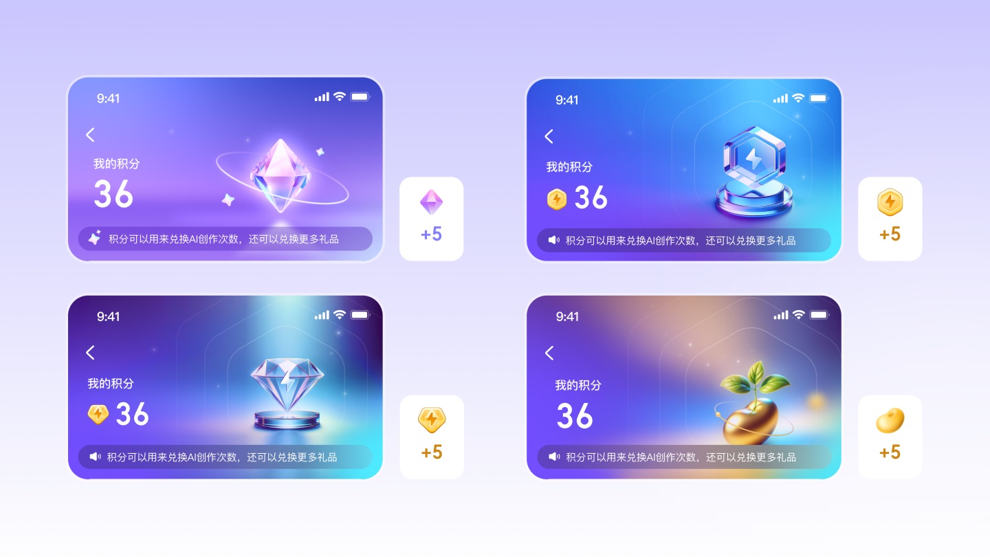 积分采用类似在手办中常用的水晶磨砂滴胶质感,在星星内部设计颜色和透光度不同的内核,增强趣味感和细节感的同时,通过内核和边缘透光性的差异对比,打造通透的光感,传达智能灵动的感受,使其更契合度加 AI 智能产品的气质。