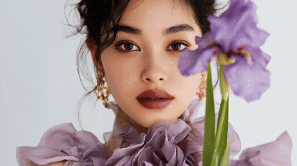 美容广告中,一位东亚模特拥有光滑的象牙色肌肤、深樱桃色的双唇和杏仁形的淡褐色眼睛。她身穿藏红花色带有立体褶皱的长裙,搭配金色珠宝,手持一朵精致的淡紫色鸢尾花,干净的白色背景营造出宁静的对比与焦点。