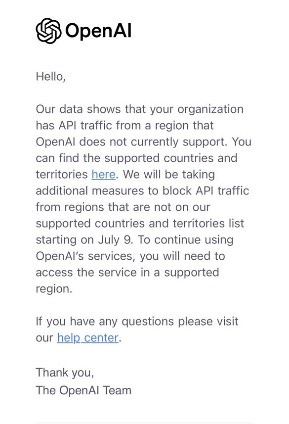 「我们的数据显示,您的组织拥有来自 OpenAl 当前不支持的区域的 APl 流量,您可以在此处找到受支持的国家和地区。从 7 月 9 日起,我们将阻止来自未列入我们支持的国家和地区名单的区域的 API 流量。如果要继续使用 OpenAl 的服务,您需要在受支持的地区访问该服务。」