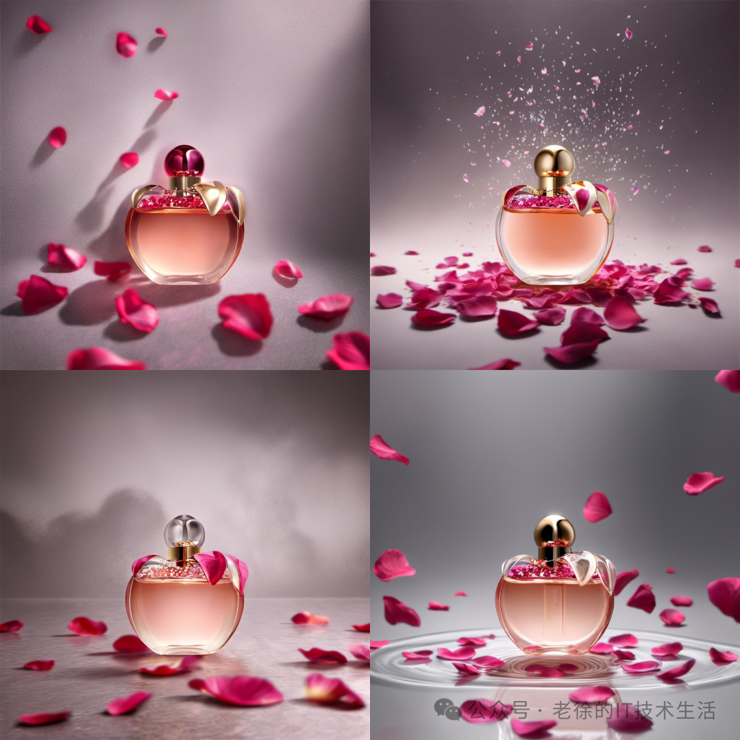 **正向提示词:**masterpiece,bestquality,8K,realistic,A bottle of perfume, rose petals falling in the water