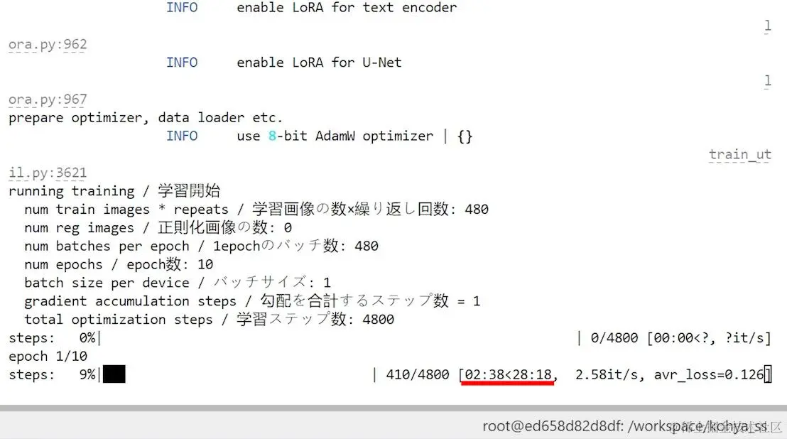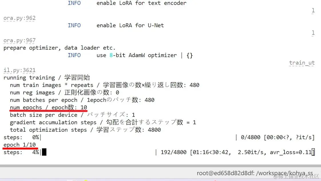 :训练开始后,需要转到命令行窗口或终端查看训练的实时状态。这个终端窗口是启动Kohya训练器时打开的,不同操作系统或环境(如本地或服务器)的界面可能略有不同。