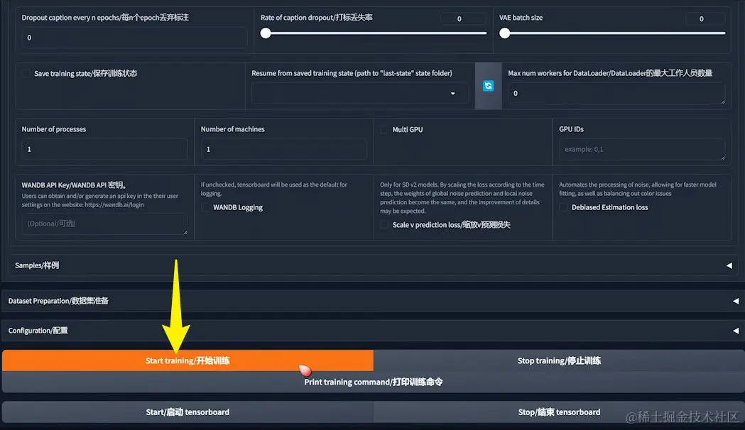 1️⃣启动训练 :在Kohya训练器中设置好所有参数后,点击“开始训练”按钮以启动训练过程。