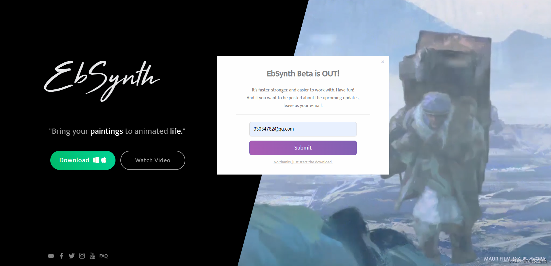 下载安装 EbSynth官网,这里需要输入email地址。