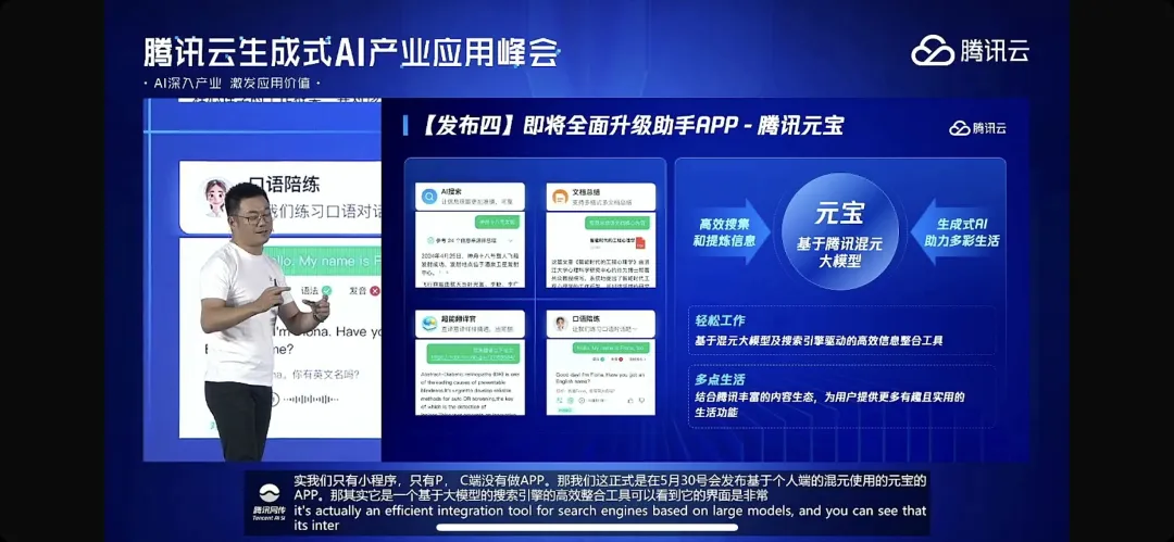 由于月底才推出,这次的发布会上,腾讯仅简单介绍了首批上线的功能,AI搜索、翻译、文档总结、口语陪练等等。