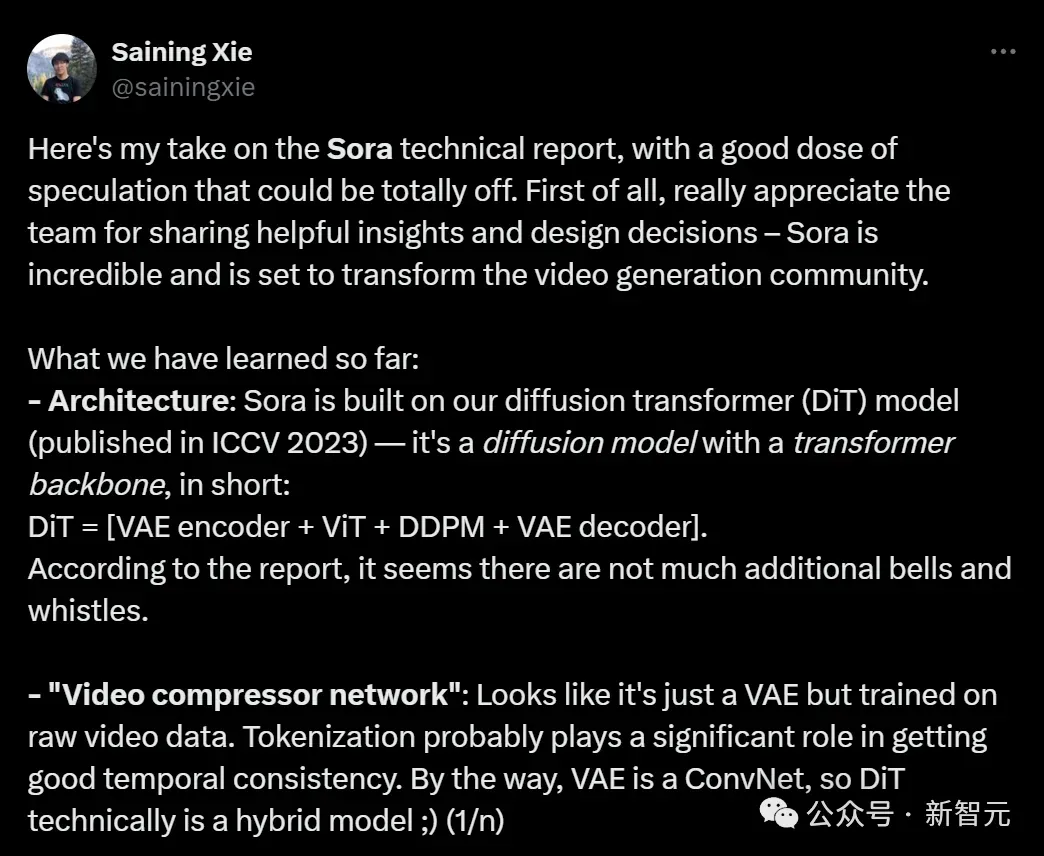 它用上了与Sora同样的DiT架构,灵感来源于纽约大学助理教授谢赛宁的研究。