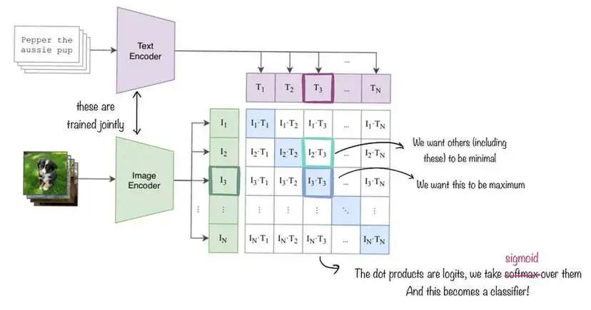 SigLIP 嵌入的工作原理说明。我们同时训练图像和文本解码器,但在我们的例子中,文本编码模块保持不变。与 CLIP 不同,我们最小化 Sigmoid 损失而不是 Softmax 损失,但大多数其他事情保持不变。