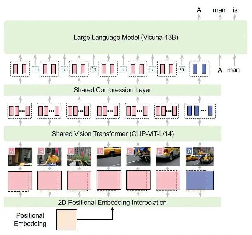 计算出潜在值后,我们将其作为图像标记添加到文本标记之前。之所以添加在前面,是因为将图像放在文本之前,可以让模型在预训练期间更容易学习。可以将其想象为具有表示实际图像的标记,然后具有表示文本中图像内容的标记:几乎就像与图像配对的标题。我们的架构与 LLaVA-UHD 的架构几乎相同(他们选择 CLIP-ViT,而我们使用 SigLIP,并且他们与 Vicuna-13B 配合使用),因此我们在下面提供了它们的图示作为参考: