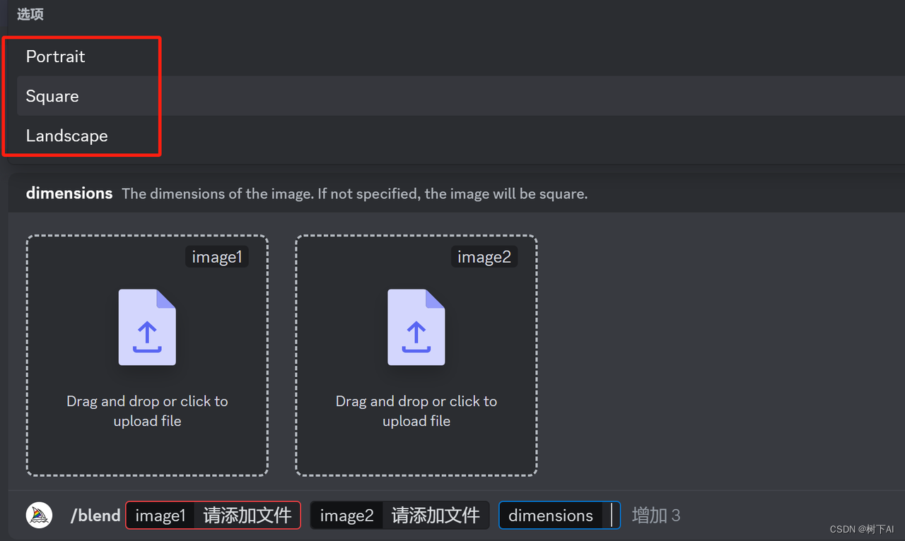 注意:此命令不适用于添加提示词。如果想要新合成的图片想要获得最好效果,需要让上传的几张图片长宽比相同