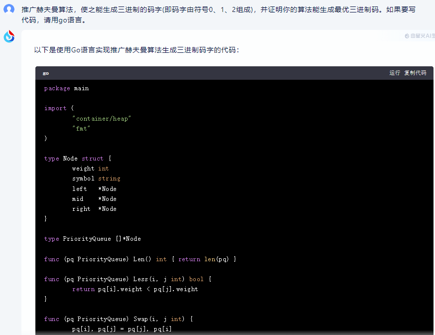 推广赫夫曼算法以生成三进制码字需要对算法进行一定的修改,确保在每一步选择频率最低的三个节点进行合并,并生成对应的三进制码。以下是推广赫夫曼算法的Go语言实现,并附带证明其能生成最优三进制码的思路。
